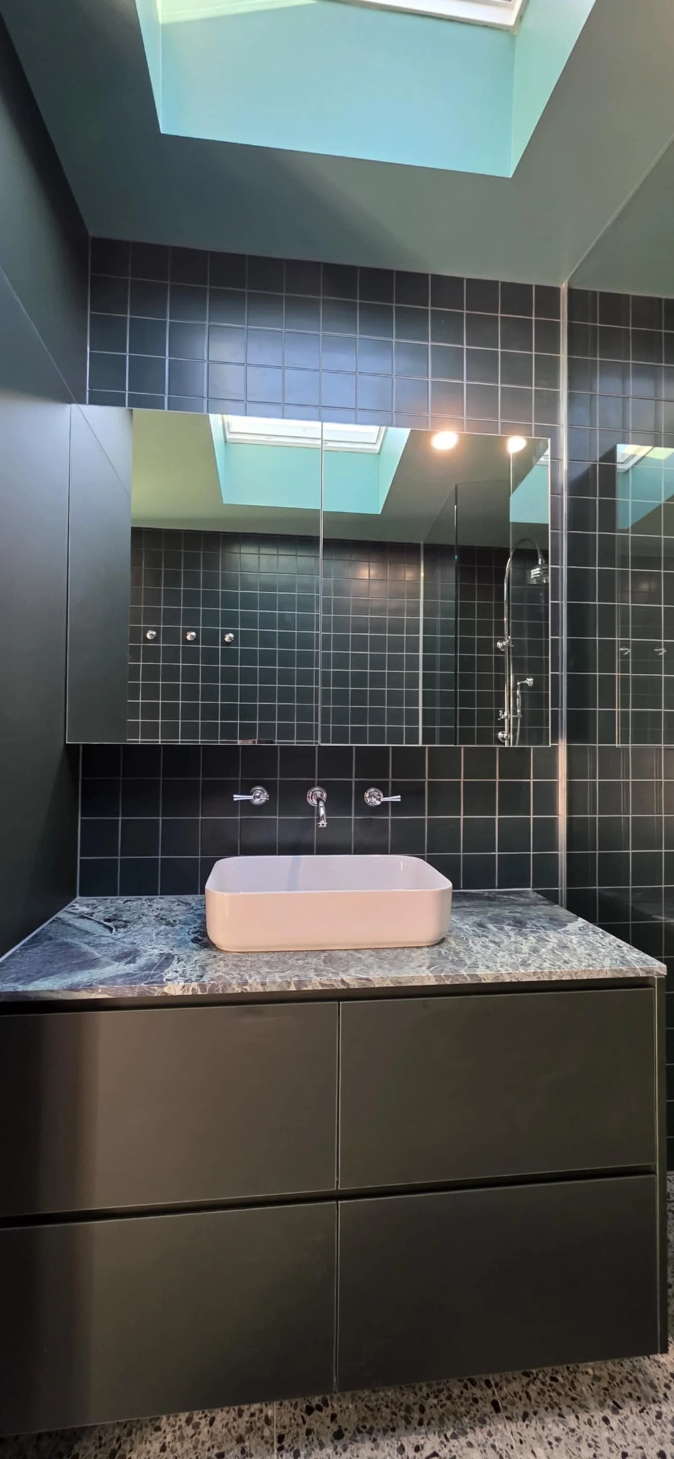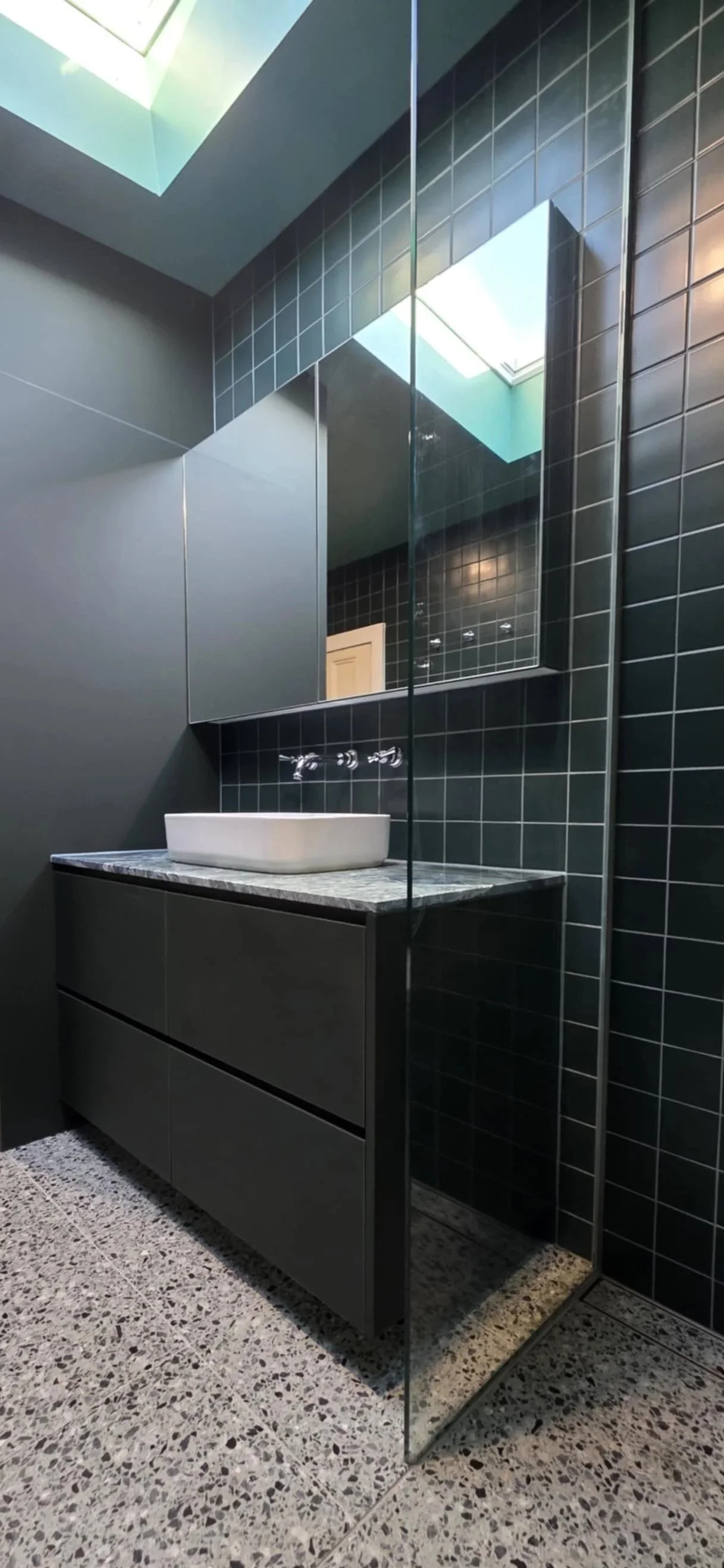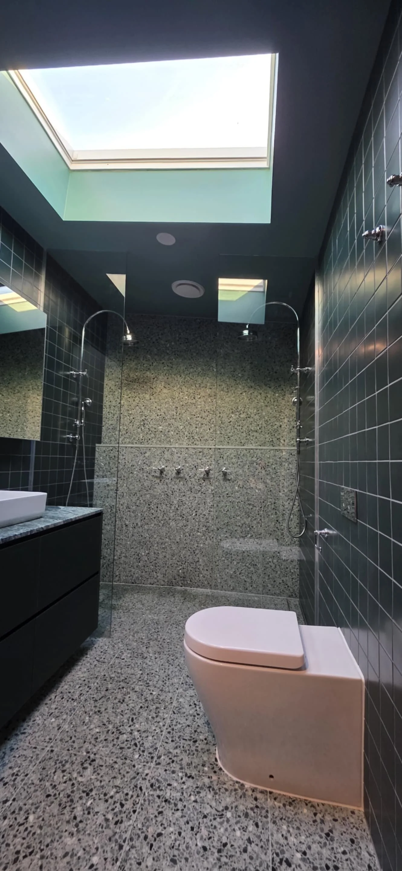 A cleverly integrated laundry is seamlessly incorporated within custom full-height joinery, maximising storage while maintaining clean, uninterrupted lines. Deep green wall tiles introduce depth and character, complemented by terrazzo flooring that adds texture and durability.